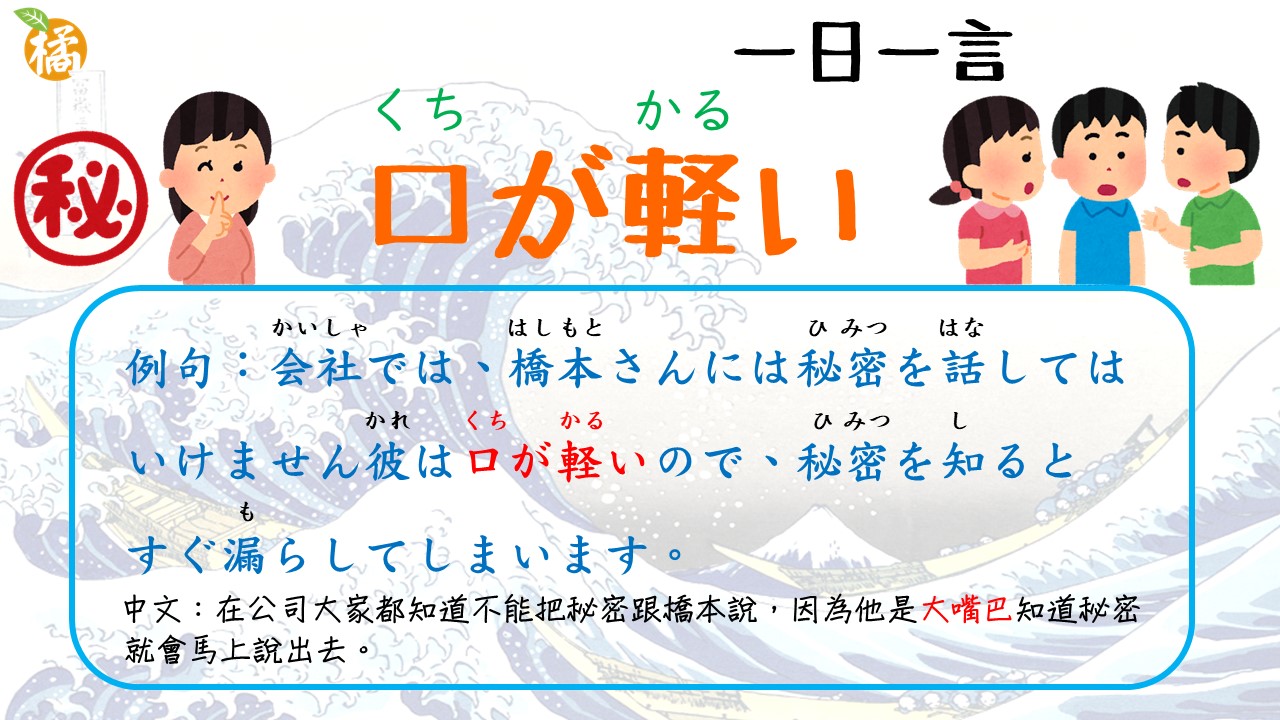 中文:在公司大家都知道不能把秘密跟橋本說,因為他是大嘴巴知道秘密就會馬上說出去。