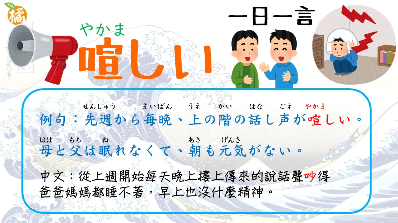 例句:先週から毎晩、上の階の話し声が喧しい。母と父は眠れなくて、朝も元気がない。