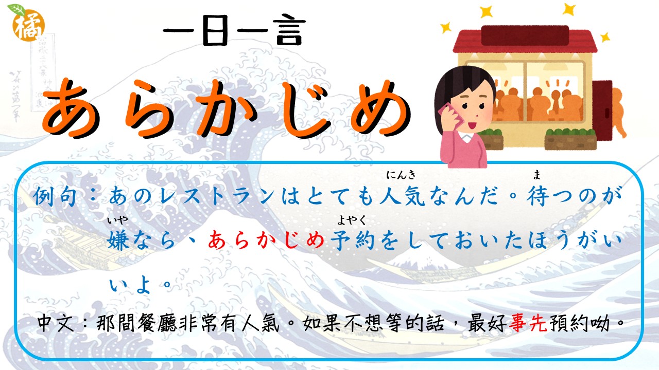 例句:あのレストランはとても人気なんだ。待つのが嫌なら、あらかじめ予約をしておいたほうがいいよ。