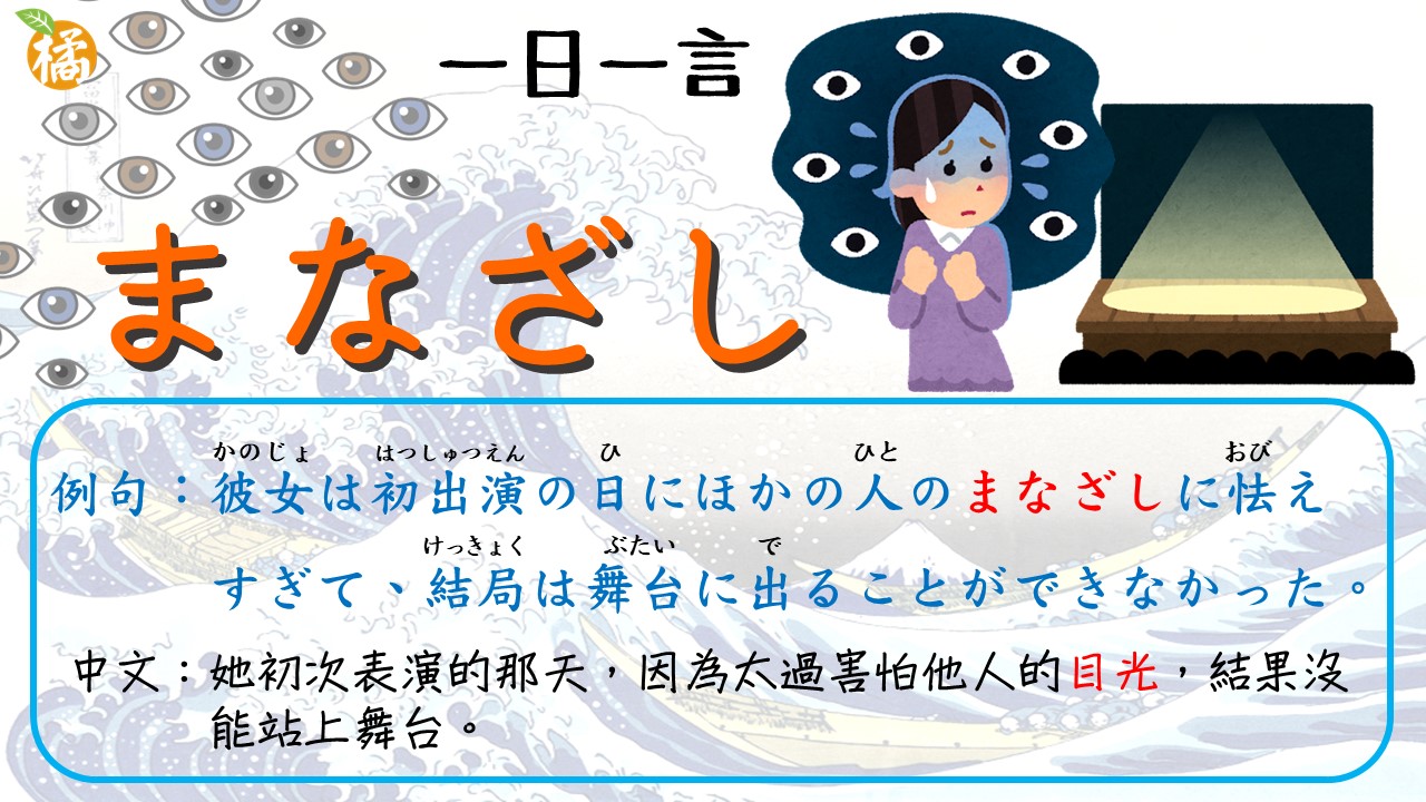 - 「まなざし(眼差し)」是較文學性的詞,比「目」或「視線」更帶有情感色彩。