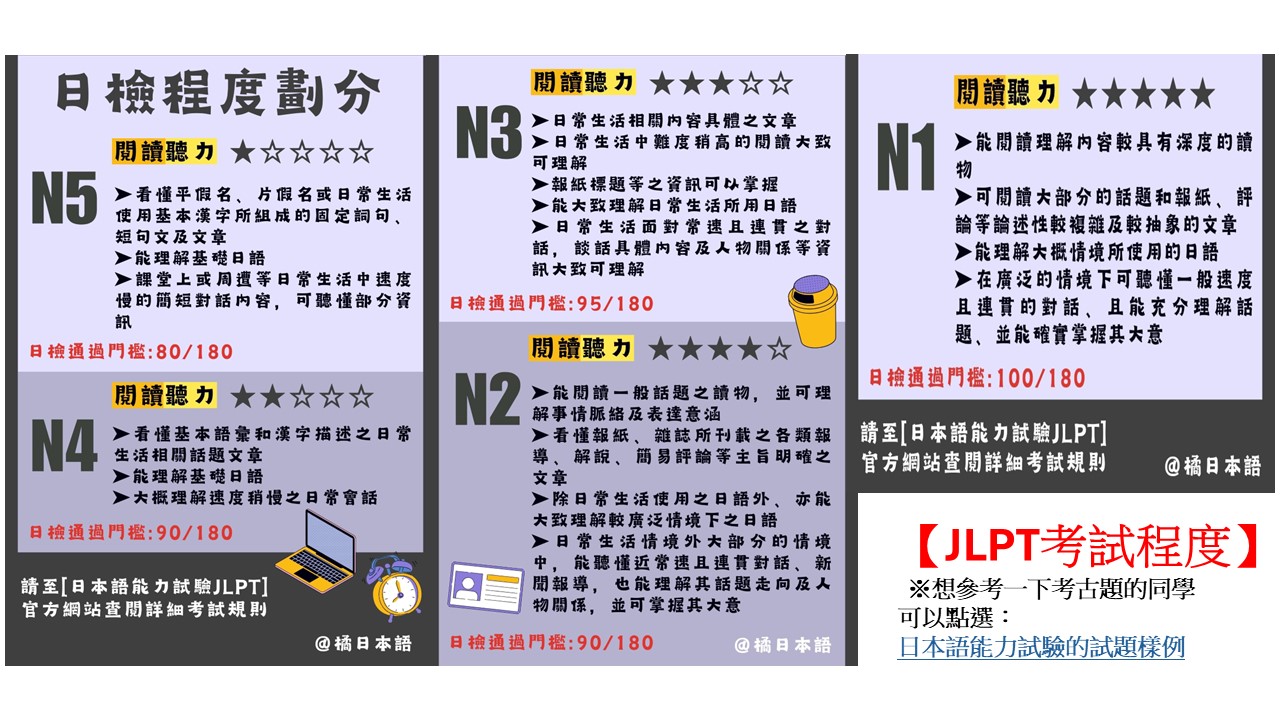 A:考試分為N1~N5共5個級別,數字越小越難,所以N1最高(約日本大學生程度)。